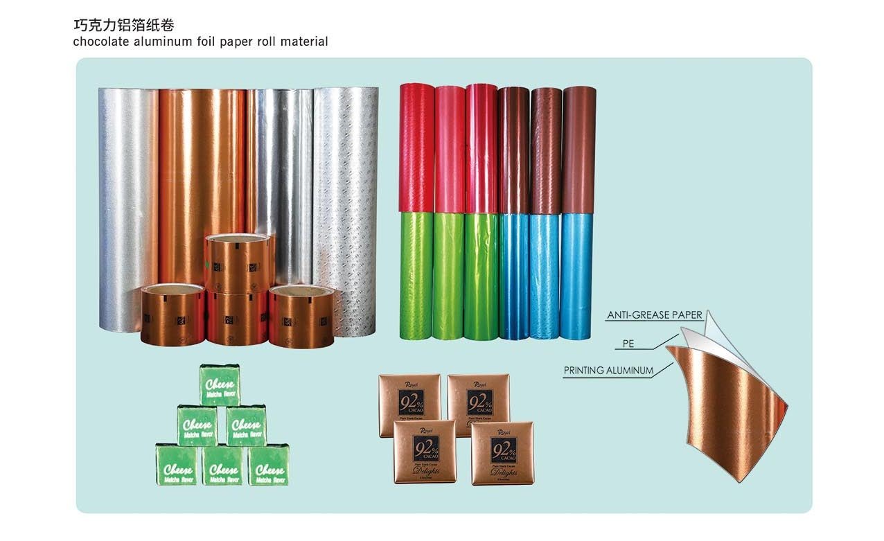 Food-grade chocolate wrapping aluminum foil composite paper roll, specially designed for fully automatic wrapping of chocolates, chocolate candies, filled chocolates, coin-shaped chocolates, and chocolate blocks. It blocks light and locks in aroma, maintains shape and prevents moisture, and is non-stick and oil-free. It boasts a high-end feel, and will not melt, turn white, or change flavor over time.